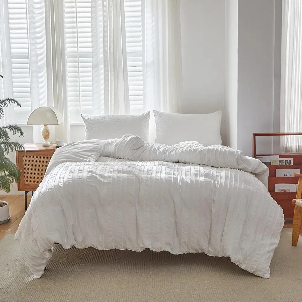 Minimalistisches weiß-beiges Bettwäsche-Set mit weichem Tufting | Modernes Streifen-Tuft-Design für Bettbezug und Kissenbezug