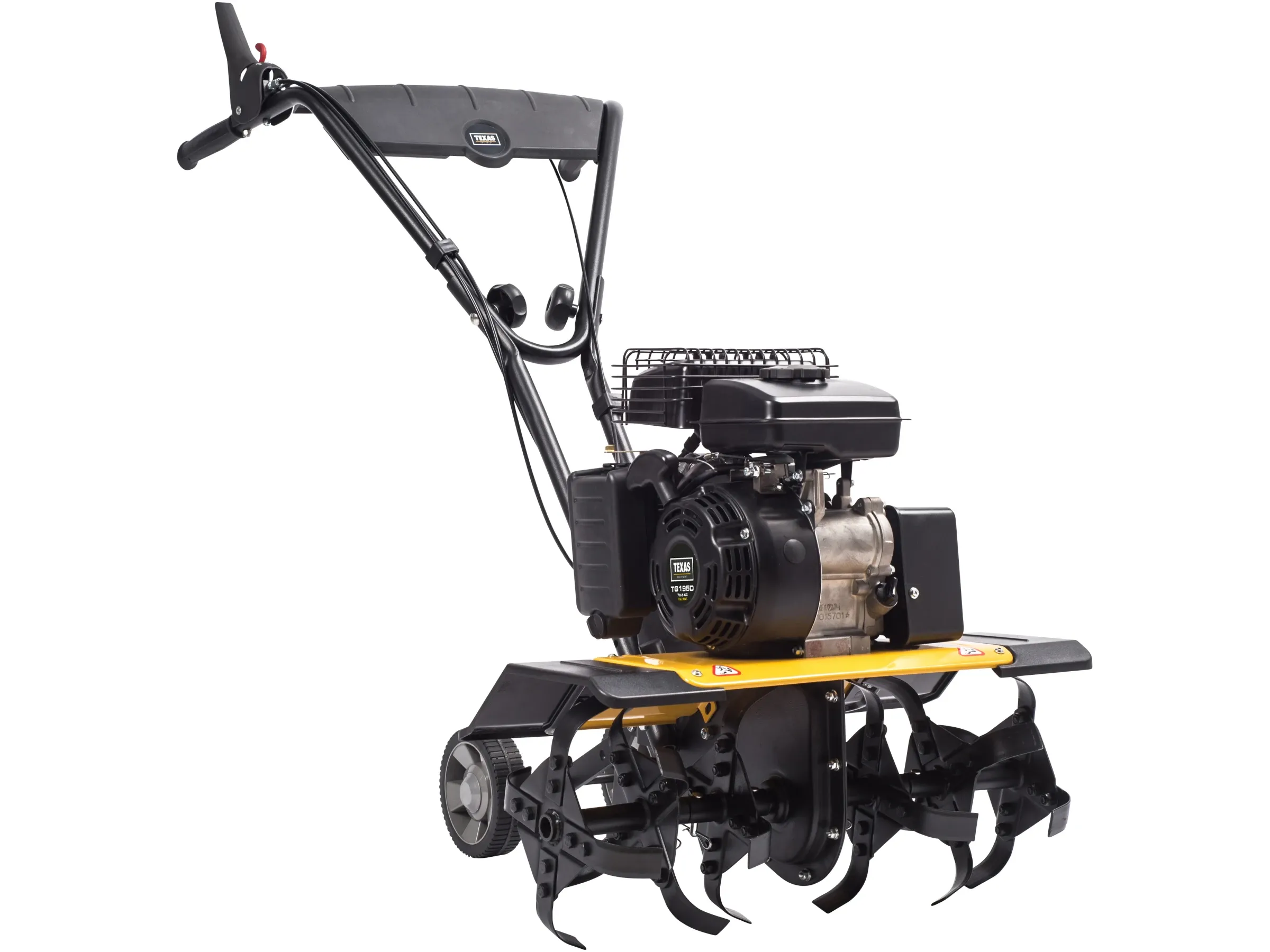 Die Texas Benzin-Motorhacke Lilli 365TG bietet Vor- und Rückwärtsgang sowie eine verstellbare Arbeitsbreite von 40-60 cm, geeignet für den Gemüsegarten. Ein hinteres Transportrad ermöglicht einfachen Transport. Die Maschine arbeitet mit 130 Umdrehungen pro Minute.