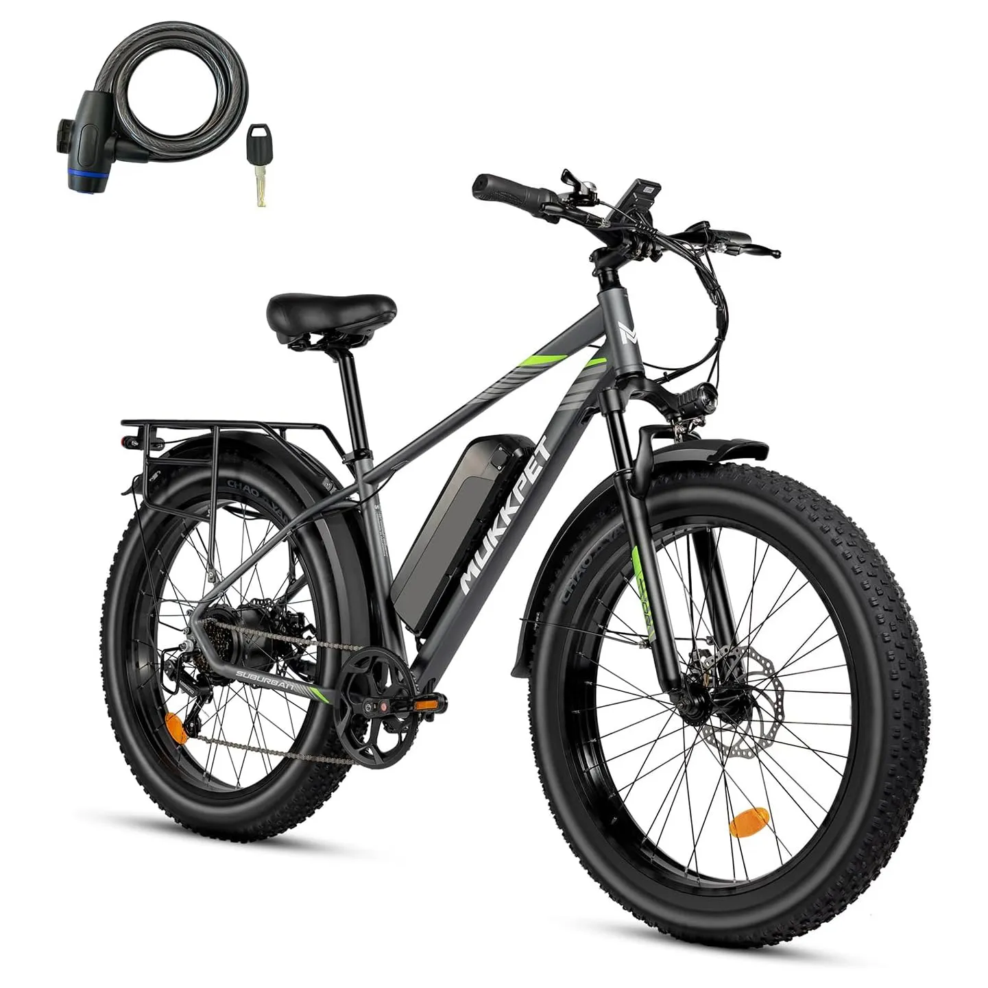 Die Mukkpet Suburban 750W ist ein Erwachsenen-Elektrofahrrad mit einem 750W bürstenlosen Motor, der Geschwindigkeiten von bis zu 40 km/h ermöglicht. Es ist optimal für unterschiedliche Gelände wie Straßen, Gras, Sand oder Gebirge geeignet. Die 48V 15Ah Batterie bietet eine Reichweite von über 72 km pro Ladung und ist durch die BMS-Technologie geschützt. Das Fahrrad hat 26-Zoll-Reifen, die eine stabile Fahrt gewährleisten. Ausgestattet mit einem Shimano 7-Gang-Antrieb bietet das E-Bike präzise und sanfte Gangwechsel entsprechend den Geländeanforderungen. Der hintere Gepäckträger wurde verstärkt und kann vielseitig genutzt werden. Ein Rücklicht sorgt für zusätzliche Sicherheit bei Nachtfahrten. Es gibt fünf Betriebsmodi: Pedalunterstützung, Gashebel, normales Fahrrad, Tempomat und Gehmodus, der das Schieben des Fahrrads erleichtert, insbesondere bei schwerer Ladung.