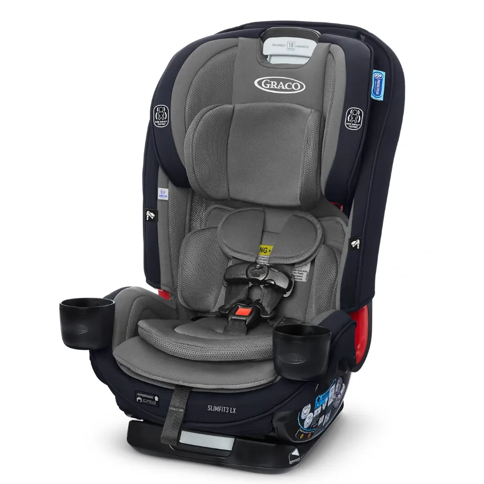 Der Graco® SlimFit3™ LX 3-in-1 Kindersitz ist unser schlankstes Design, das 3 Sitze auf der Rückbank ermöglicht und Platz spart, ohne Kompromisse bei Sicherheit und Funktionalität einzugehen. Dieser schmale All-in-One-Kindersitz wächst mit Ihrem Kind, von einem rückwärtsgerichteten Gurt (5-40 lb) über einen vorwärtsgerichteten Gurt (22-65 lb) bis hin zum Highback-Booster (40-100 lb). Der integrierte Gurtverriegelung ermöglicht eine einfache Installation im vorwärtsgerichteten Modus, während der exklusive InRight™ LATCH-Anschluss eine einfache und sichere Installation unterstützt. Der Simply Safe Adjust™ Harness ermöglicht das Anpassen der Kopfstütze und des Gurtes in 10 Positionen. Der Rapid Remove-Bezug kann in 60 Sekunden entfernt und ist maschinenwaschbar. Die luftdurchlässigen AirFlow-Kanäle sorgen für Belüftung und die zwei Becherhalter sind für die Dreifachsitzkonfiguration ausgelegt. Der Stahlverstärkte Rahmen bietet Stärke und Langlebigkeit, während der EPS-Schaum eine effektive Stoßenergieverwaltung bietet.