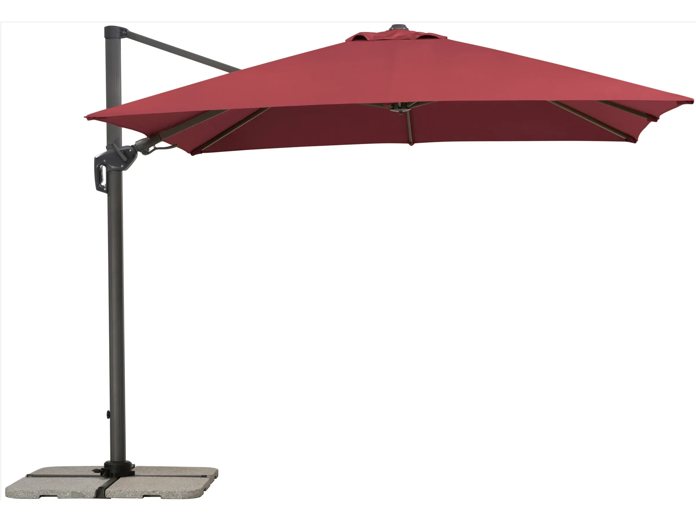 Der Sonnenschirm Rhodos von Schneider in Bordeaux bietet eine quadratische Form, die Schatten für Garten oder Terrasse spendet. Der seitlich angebrachte Mast ermöglicht eine freie Nutzfläche unter dem Schirm, um Möbel flexibel zu platzieren.