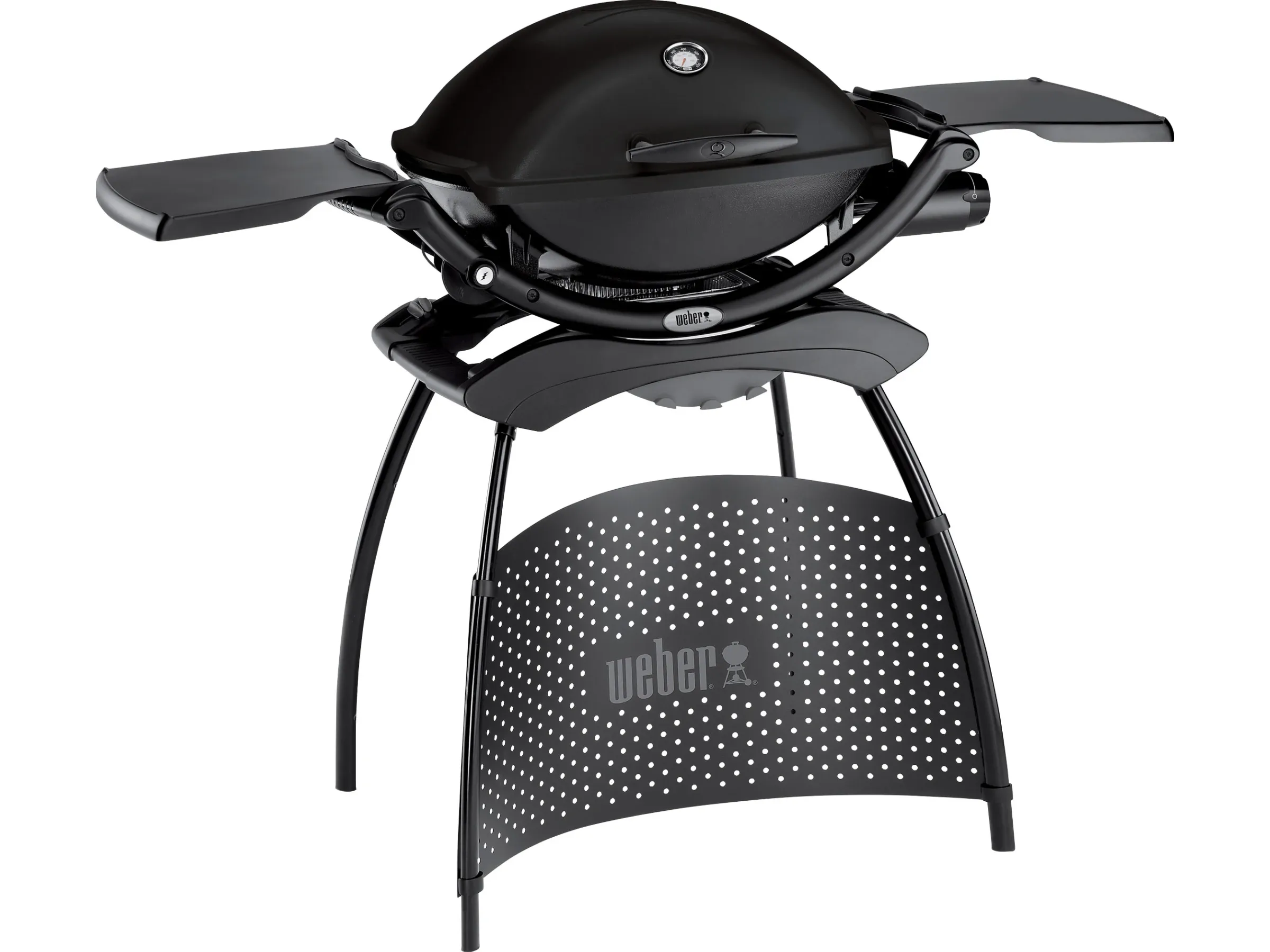 Ausstattung: - Zweigeteiltes Grillrost aus Gusseisen - Herausnehmbare Fettauffangschale - Elektrische Zündung - Deckelthermometer - Glasfaserverstärkter Nylonrahmen - Aluguss-Kessel und Gehäuse - Klappbare Seitentische als Ablagefläche