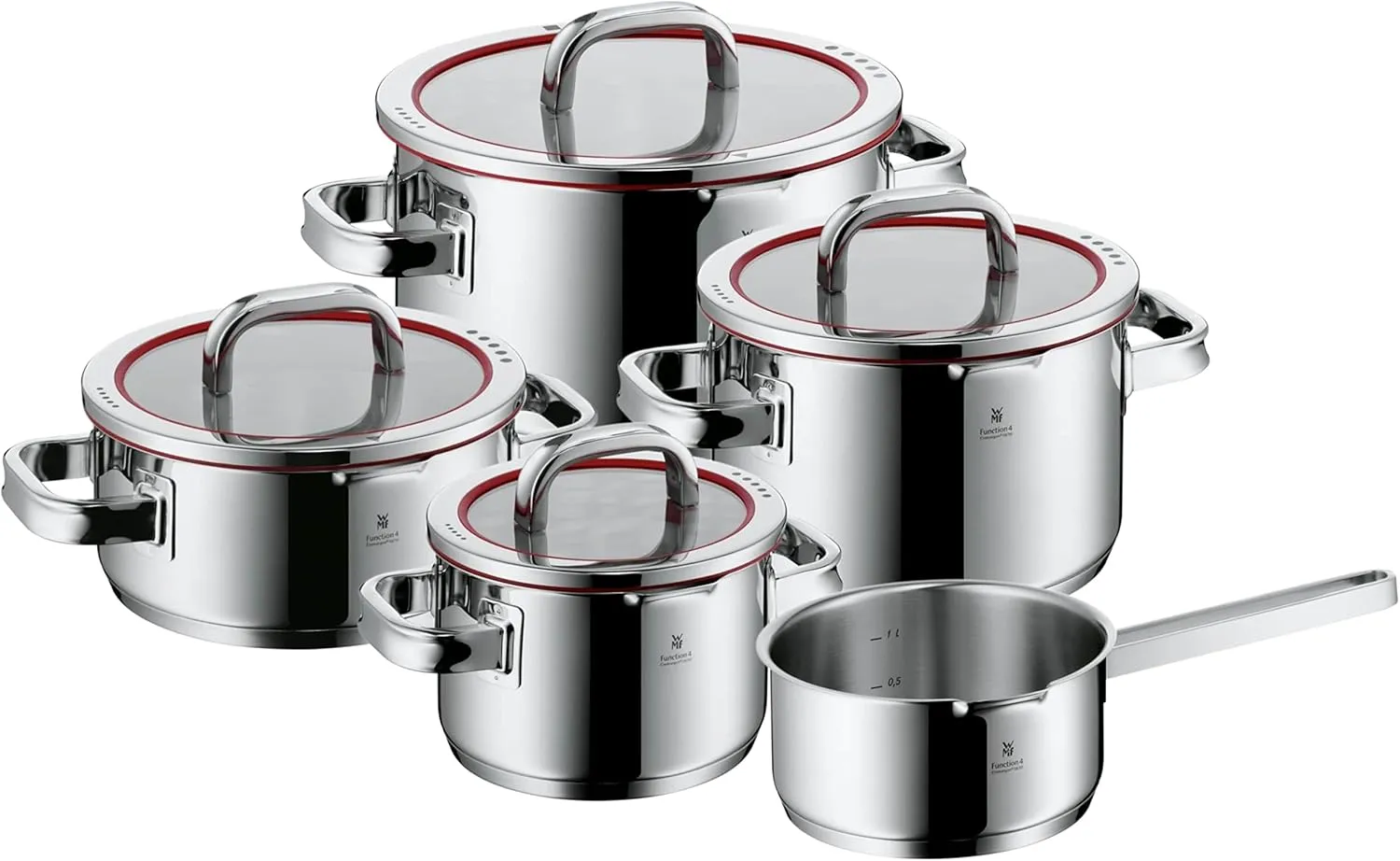 Dieses Set enthält: 1x Bratentopf mit Deckel 20 cm (V 2,5l), 3x Fleischtopf mit Deckel 16 cm (V 1,9l), 20 cm (V 3,4l), 24 cm (V 5,7l), 1x Stielkasserolle ohne Deckel 16 cm (V 1,4l). Die Töpfe bestehen aus Cromargan Edelstahl 18/10, poliert und unbeschichtet, geeignet für Spülmaschine und Ofen bis 250°C (mit Deckel 70°C). Sie sind kompatibel mit Induktion, Gas, Elektro und Glaskeramikherden. Die Griffe erhitzen sich nicht während des Kochens. Der Glasdeckel kann in vier Positionen verwendet werden: große/kleine Löcher, offen/geschlossen zum Abgießen oder Garen.